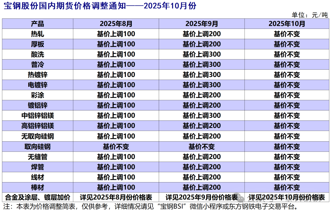 經(jīng)研究決定,寶鋼股份內(nèi)銷價(jià)格2025年10月份在9月份基礎(chǔ)上調(diào)整公告如下(以下除特殊注明外,均為不含稅):