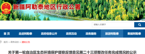 12月4日,新疆阿勒泰地區(qū)行政公署發(fā)布關(guān)于第一輪自治區(qū)生態(tài)環(huán)境保護(hù)督察反饋意見第二十三項整改任務(wù)完成情況的公示,公示時間為2025年12月4日至12月17日,共10個工作日。