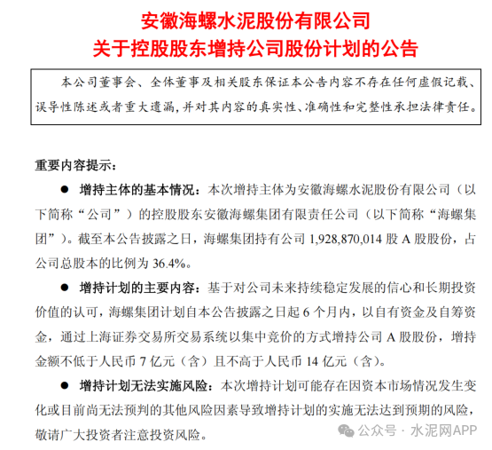 2月25日,海螺水泥發(fā)布公告稱,基于對公司未來持續(xù)穩(wěn)定發(fā)展的信心和長期投資價值的認可,公司控股股東海螺集團計劃自公告披露之日起6個月內(nèi),以自有資金及自籌資金,通過上海證券交易所交易系統(tǒng)以集中競價的方式增持公司A股股份,增持金額不低于人民幣7億元(含)且不高于人民幣14億元(含)。