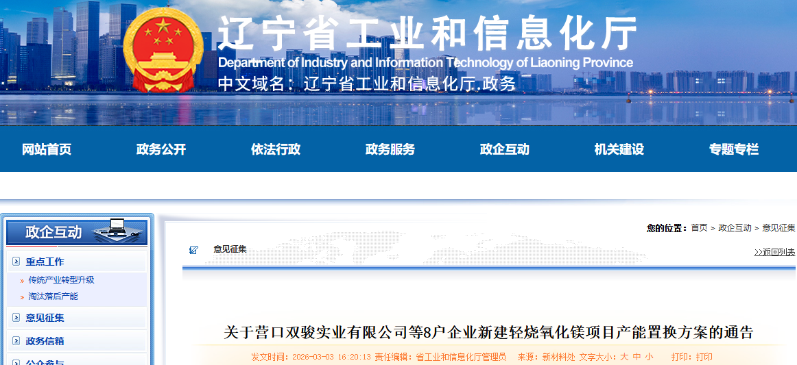 按照《遼寧省人民政府辦公廳關(guān)于推進(jìn)菱鎂行業(yè)高質(zhì)量發(fā)展的實施意見》(遼政辦發(fā)〔2023〕15號)、《省直7部門關(guān)于做好菱鎂行業(yè)專項整治有關(guān)工作意見的函》(遼發(fā)改工業(yè)字〔2026〕8號)、《遼寧省菱鎂礦浮選及鎂砂行業(yè)產(chǎn)能置換辦法》(遼工信建材〔2024〕18號)要求,根據(jù)菱鎂行業(yè)專項整治工作進(jìn)展,經(jīng)企業(yè)申請、營口市工信部門初審、我廳審核,我廳于2026年2月11日至3月2日,對營口雙駿實業(yè)有限公司等8戶企業(yè)新建輕燒氧化鎂項目產(chǎn)能置換方案進(jìn)行了公示,公示期間無異議,現(xiàn)予通告。